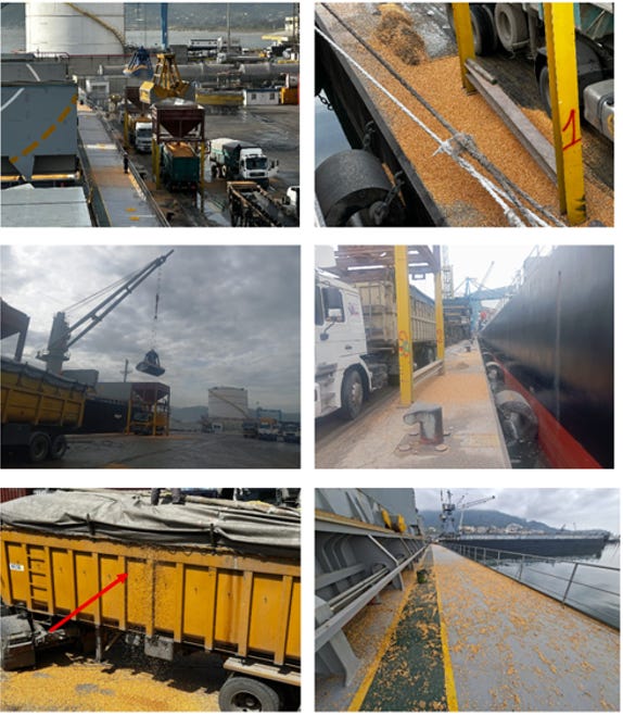 OUR SURVEYORS TAKE NUMEROUS PHOTOS DEPICTING CARGO WASTE/SPILLAGE ASHORE, AND ASSIST THE MASTER ON ISSUANCE OF LETTER OF PROTEST TO THE PORT OPERATORS.